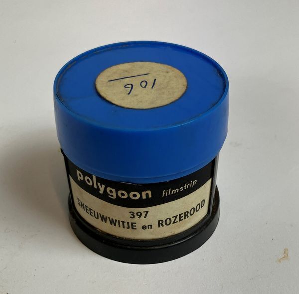 Filmstrook, 35mm met 28 zwart-wit afbeeldingen over "Sneeuwwitje en Rozerood", in plastic koker met deksel.Gebruikt in het onderwijs, met projector Z2564.