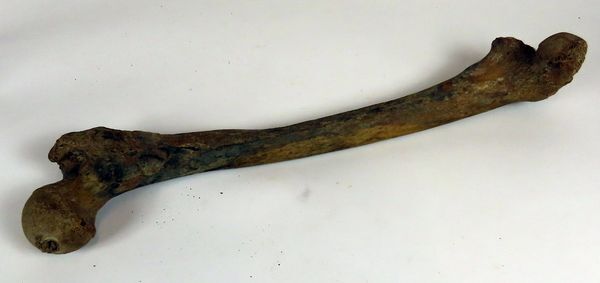 Skeletonderdeel van een mens, zijnde een dijbeen met kop van heupgewricht en bovenste deel van kniegewricht. Het bot van de knieschijf is incompleet.