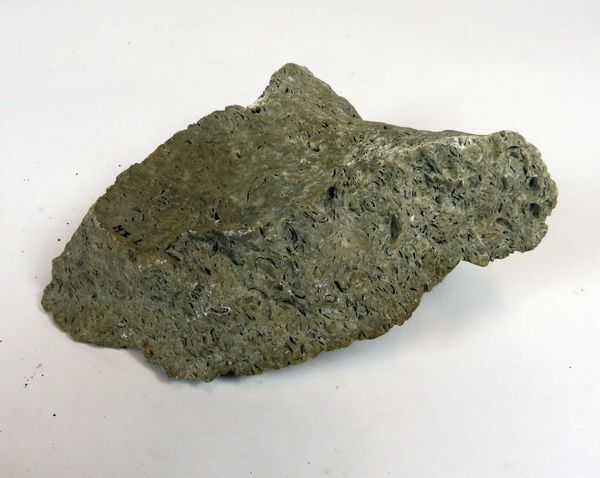 Scherf van een grijsbakkend aardewerken pot of vat met aan de rand een verdikking, bedoeld als handvat. Op de scherf zitten glinsterende puntjes, mogelijk zoutkristallen.