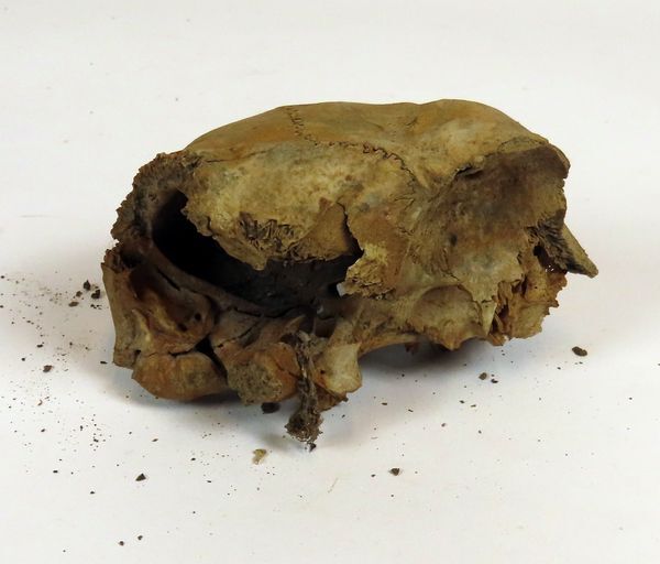 Gedeelte van een dierlijke schedel, mogelijk van een kat. De fontanellen zijn duidelijk zichtbaar, evenals de oogbogen.