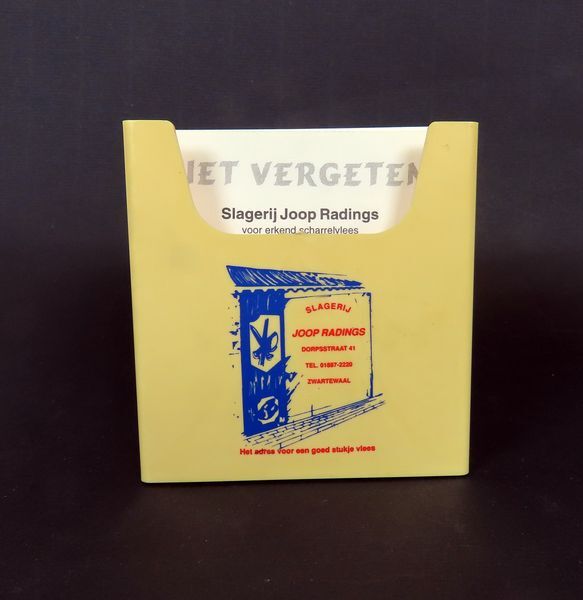 Memoblokhouder van wit plastic met drievakjes om pennen in te zetten. Op de voorzijde de afbeelding in blauw van winkel, met de tekst in rode letters: Slagerij Joop Radings, dorpsstraat 41. tel. 01887 - 2220 Zwartewaal. Het adres voor een goed stukje vlees. Op de memoblaadjes in zwarte inkt: NIET VERGETEN! Slagerij Joop Radings voor ...