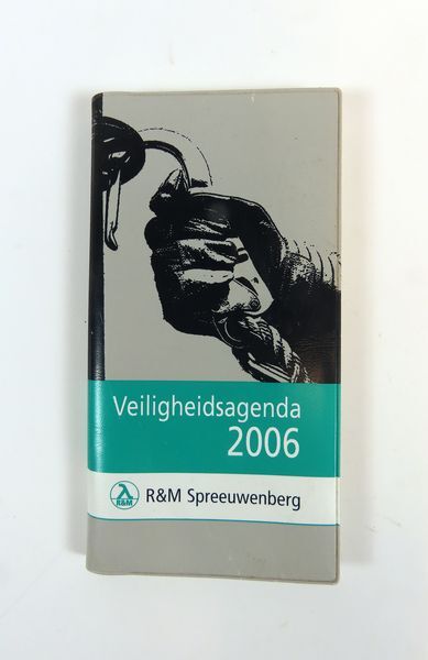 Agenda, zijnde aan Veiligheidsagenda 2006. Inhoud met ringband, aft van grijs plastic met afbeelding van hand die een kabel inhaakt. Onderop de vermelding R & M Spreeuwenberg.