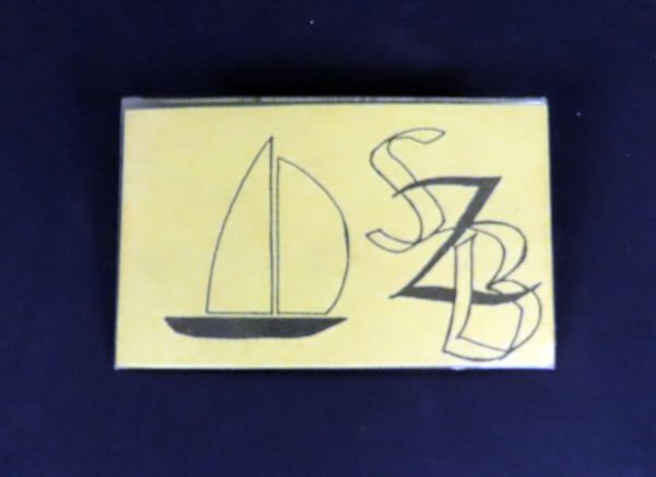 Badge met op een geel kaartje de vermelding SZB, rechts naast een zeilboot. Gevat in plastic houder. De badge is met een veiligheidsspeld op te spelden.