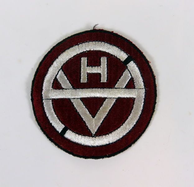Embleem, witte markeringen: rondje, dwarsstreep een H en een V, op rode achtergrond.