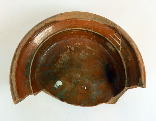 Deel van ronde roodbakkend aardewerken schaal met schuine geprofileerde bovenrand; in- en uitwendig geglazuurd.