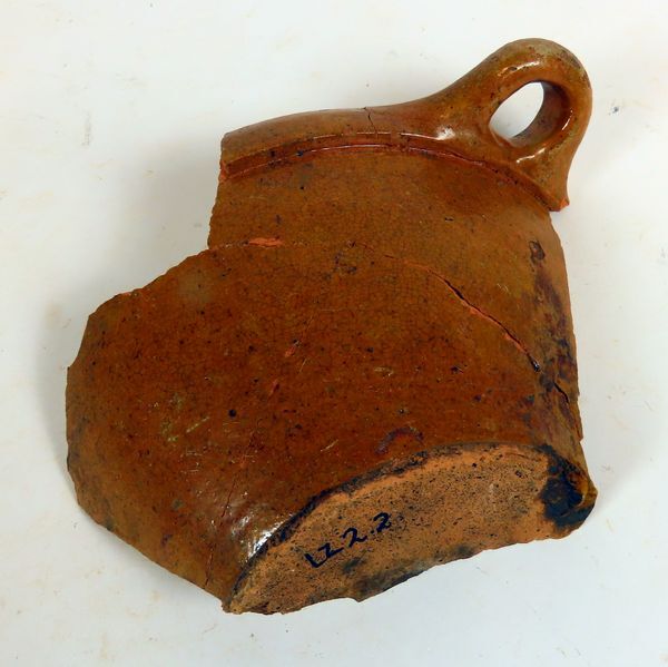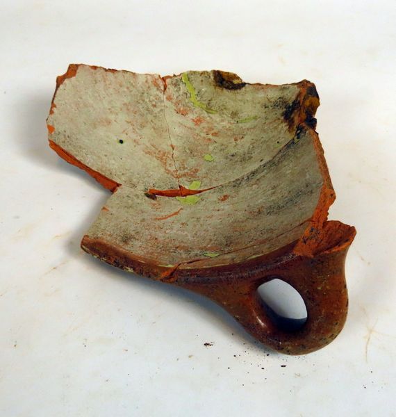 Twee aan elkaar gelijmde scherven van roodbakkende aardewerken kookpot met oor. Glazuur aan de binnenzijde is nagenoeg geheel verdwenen.