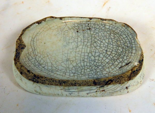 Klein ovaal grijsbakkend aardewerken bakje, mogelijk onderdeel van een groter object. Boven- en onderzijde zijn wit geglazuurd.