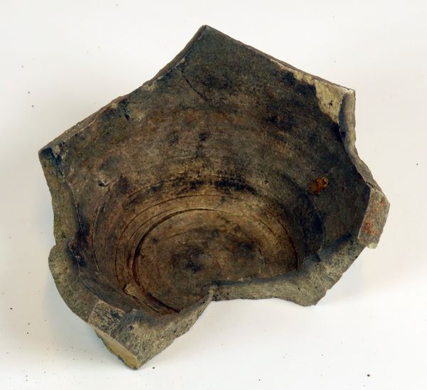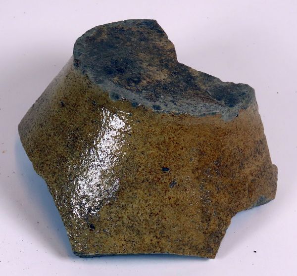 Scherf van de bodem van een kruik; mogelijk een baardmankruik. Buitenzijde geglazuurd.