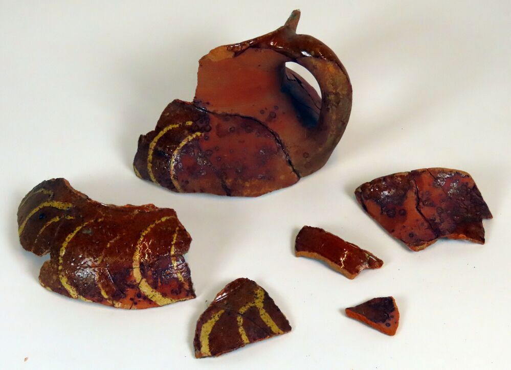 Zestal scherven van een kan. Feitelijk gaat het om 18 scherven die gedeeltelijk aan elkaar zijn gelijmd. Drie scherven met gele slibversiering. Gedeeltelijk geglazuurd.
