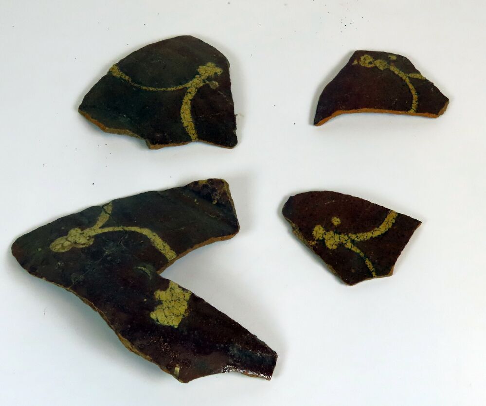 Een viertal scherven van (vermoedelijk) een kan met gele slibversiering. Een van de scherven bestaat uit twee aan elkaar gelijmde scherven. Buitenkanten geglazuurd.