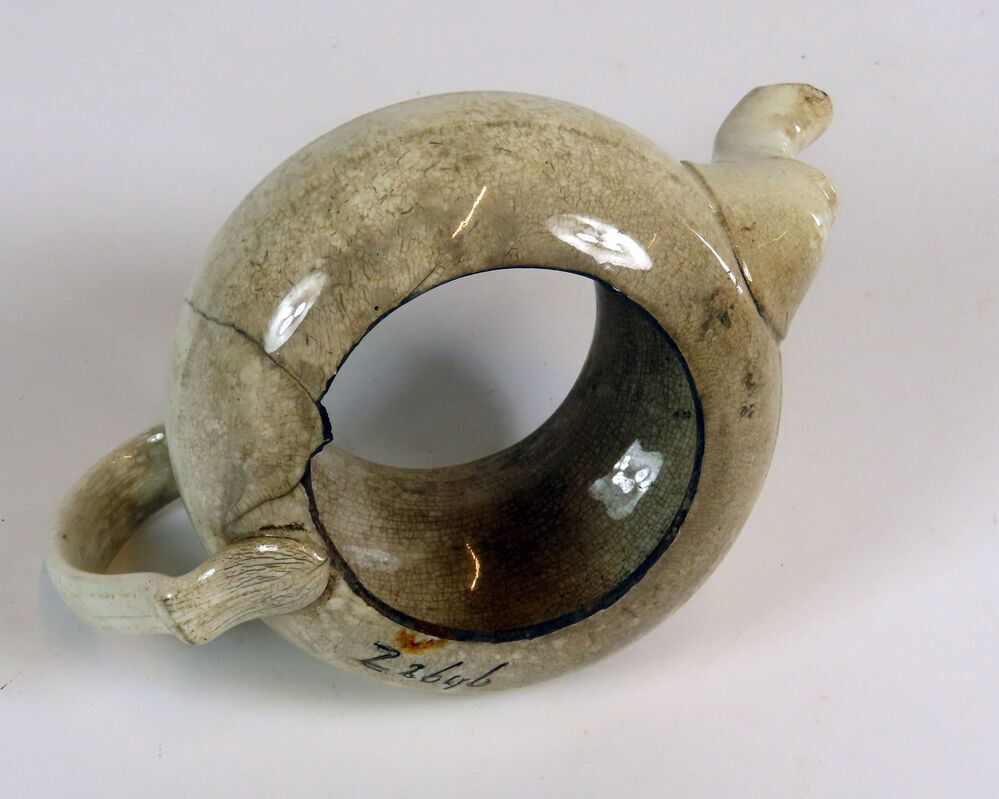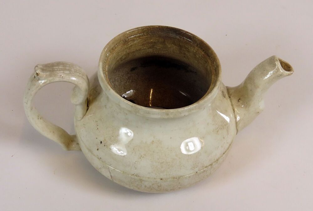Cremekleurig aardewerken theepotje zonder bodem met op de buik een gladde band; deksel ontbreekt.
