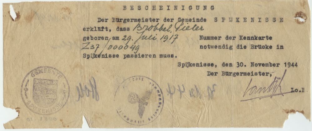 Duits document, toestemming passeren brug Spijkenisse aan P. Brobbel. Uitgegeven op 30 november 1944.