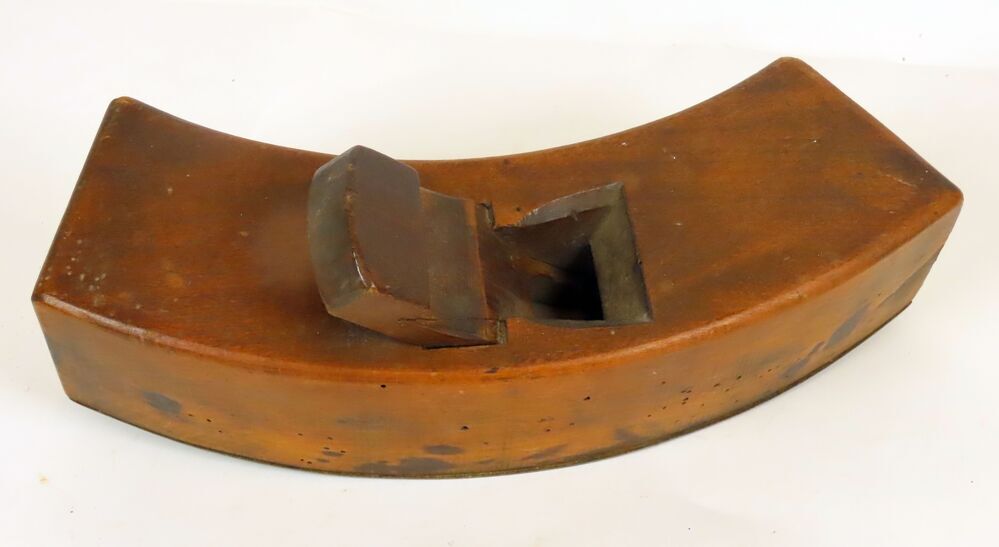 Halfronde segmentvormige blokschaaf met aan de onderzijde een metalen plaat als geleider die met 11 (origineel 14) koperen schroeven is vastgezet. Werd door kuiper gebruikt voor het gelijk schaven van de kopse kanten van de duigen.