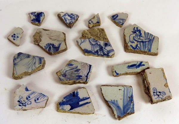Vijftien scherven van geglazuurde wandtegels beschilderd met diverse motieven.