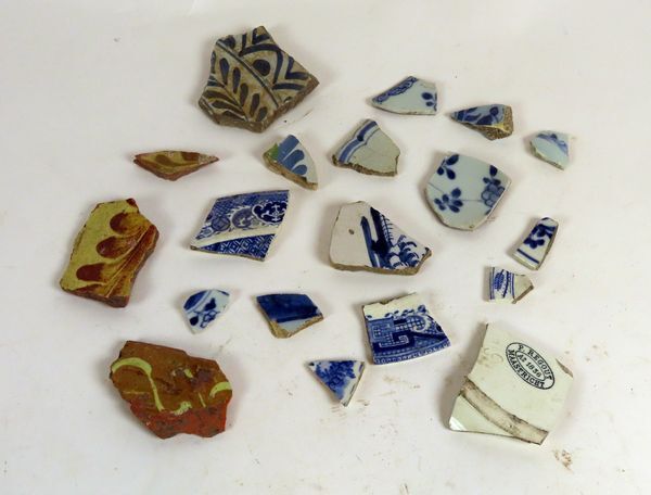 Drie scherven roodbakkend aardewerk, een scherf grijsbakkend aardewerk, een scherf witbakkend aardewerk van P. Regout en 14 scherven Delfts blauw aardewerk. Nagenoeg alle scherven zijn tweezijdig geglazuurd.