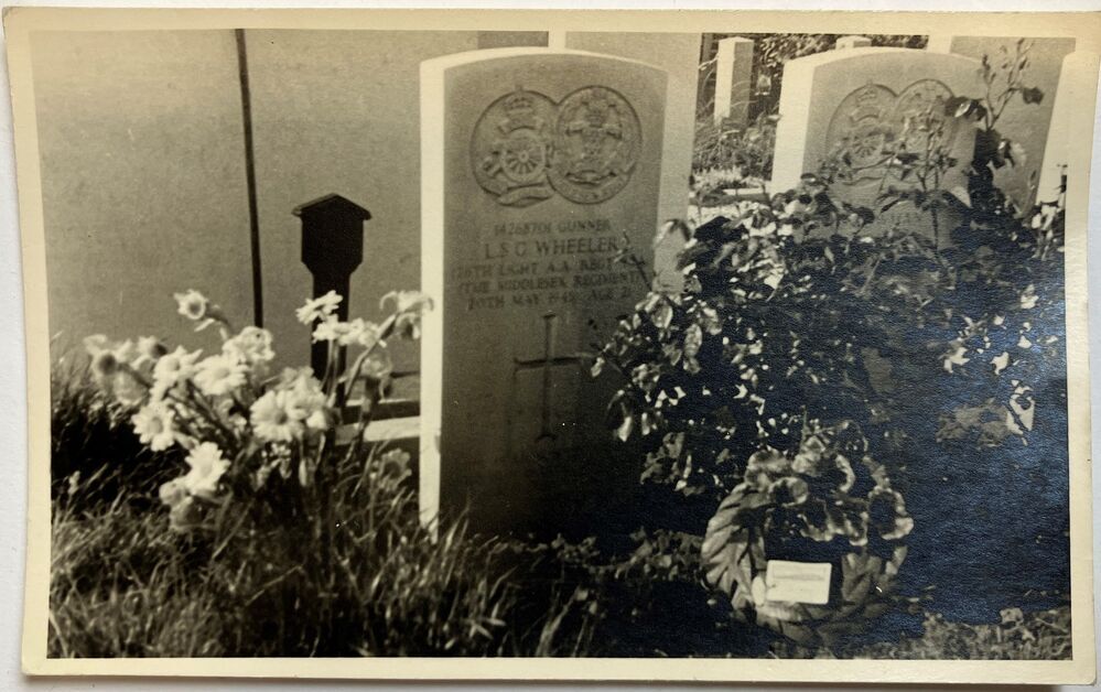 Foto, tonende een zerk met de naam van L.S.C. Wheeler., omringd met bloemen en een krans.