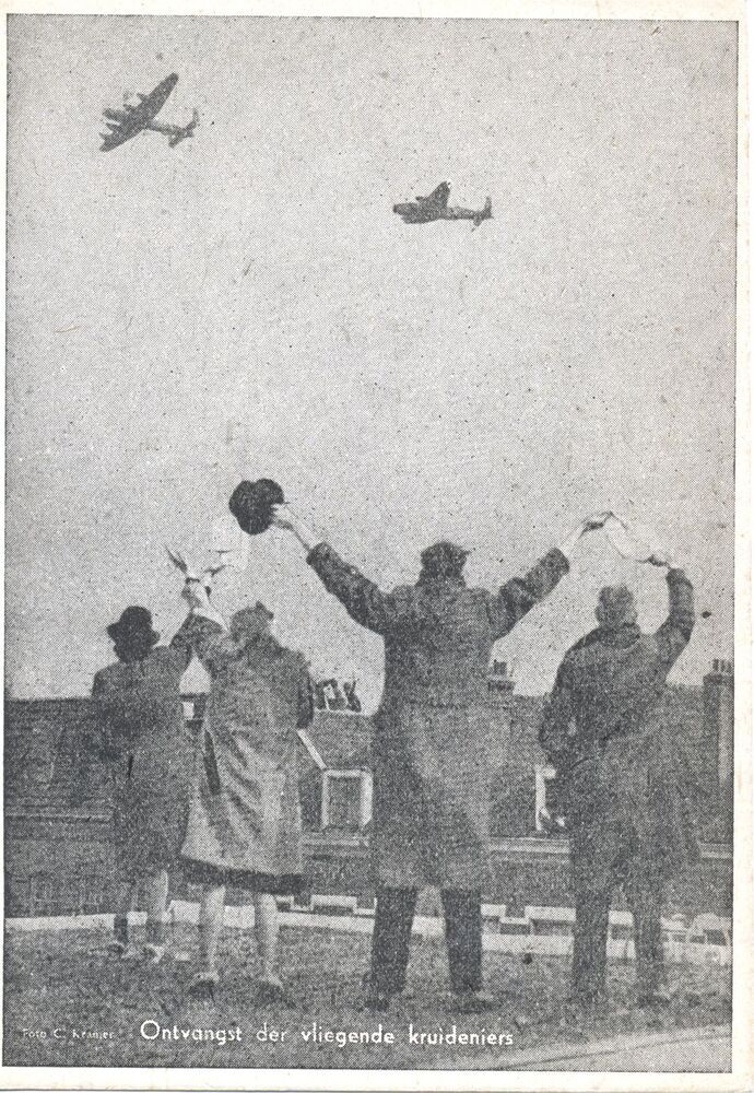 Groepje mensen staat te zwaaien naar bommemwerpers die voedsel uitwerpen.