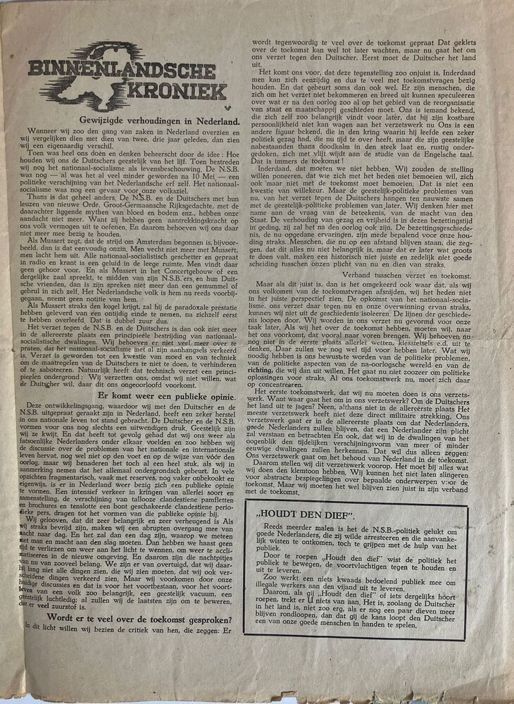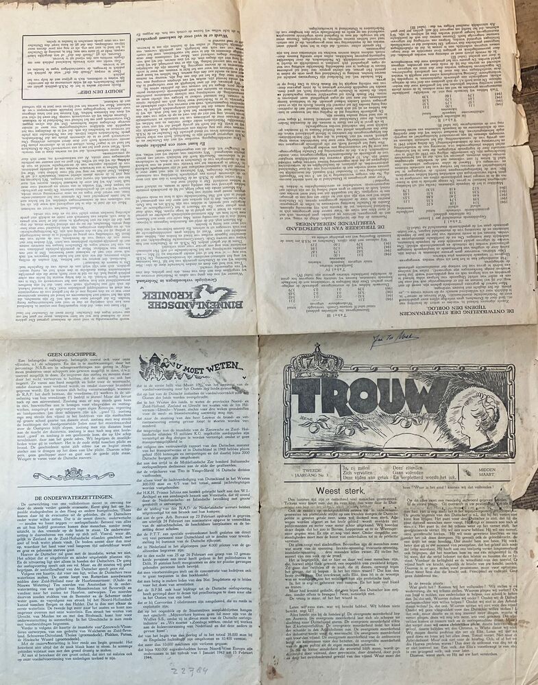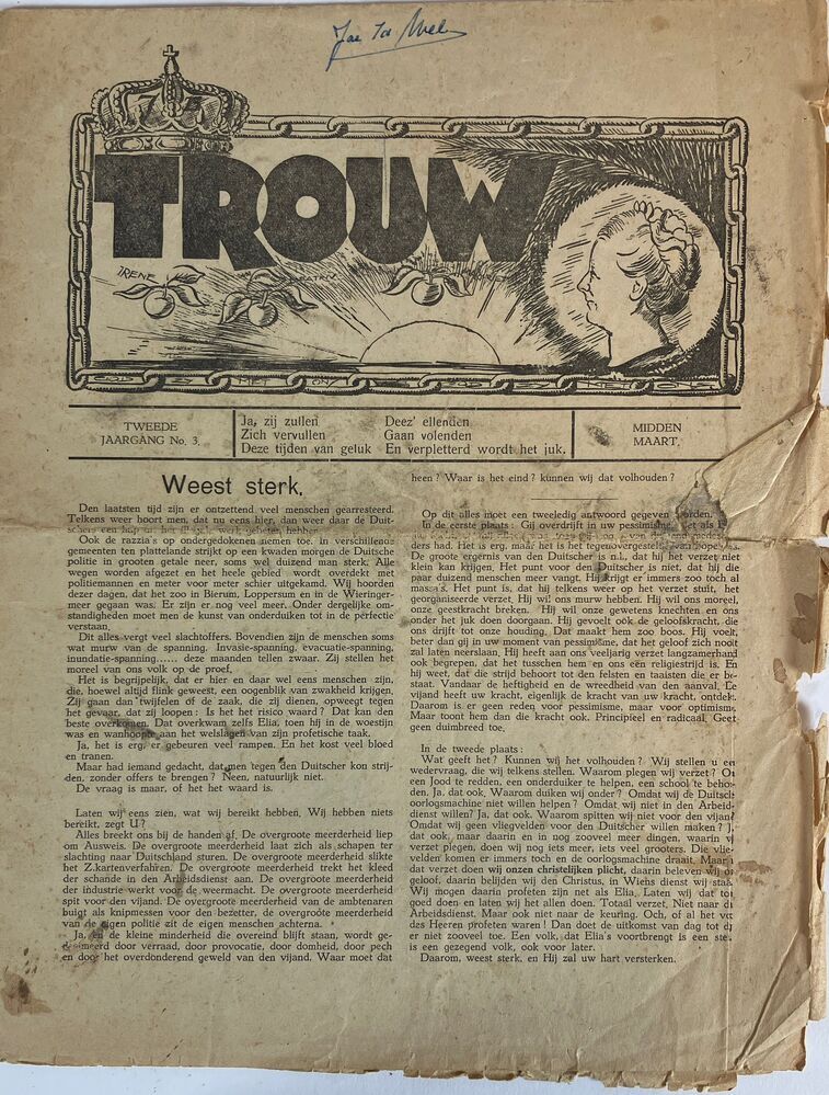 exemplaar van de illegale krant TROUW , 2e jaargang No 3, 4 pagina's nog aan elkaar verbonden als 1 vel.