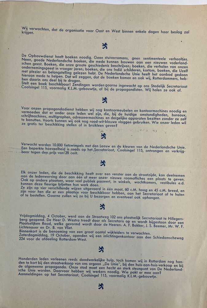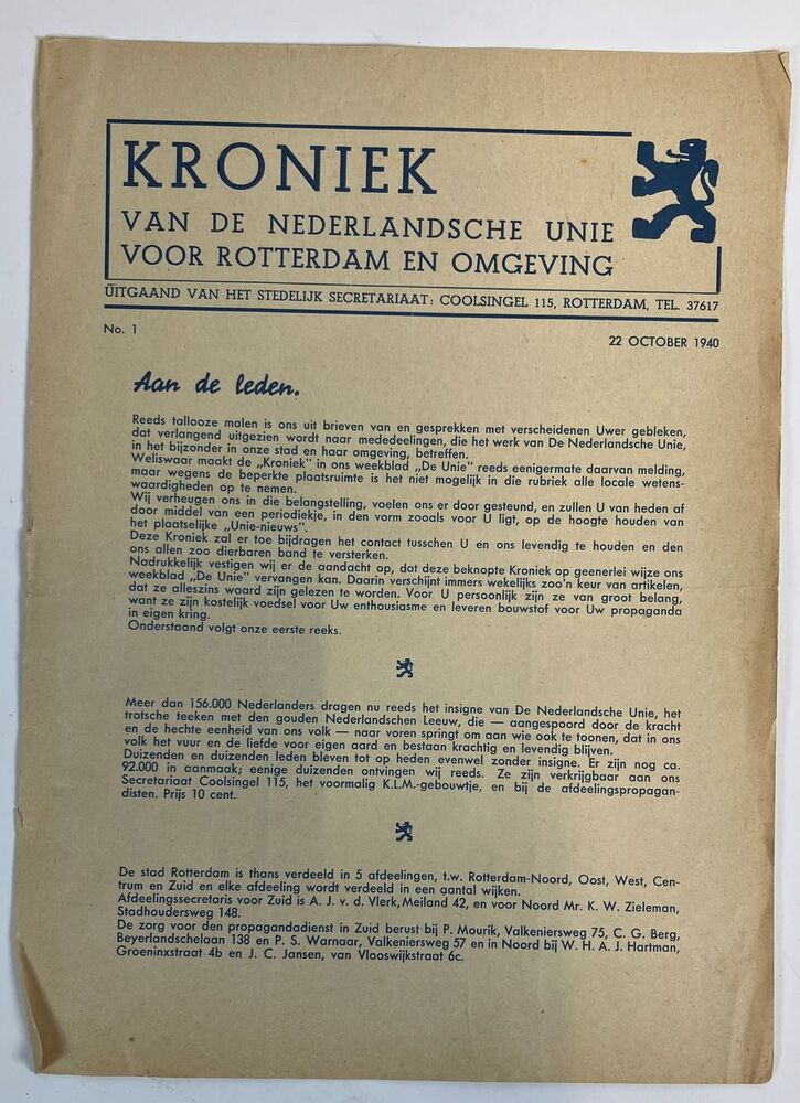 Kroniek van de Nederlandse Unie voor Rotterdam en Omgeving No.1 22 october 1940