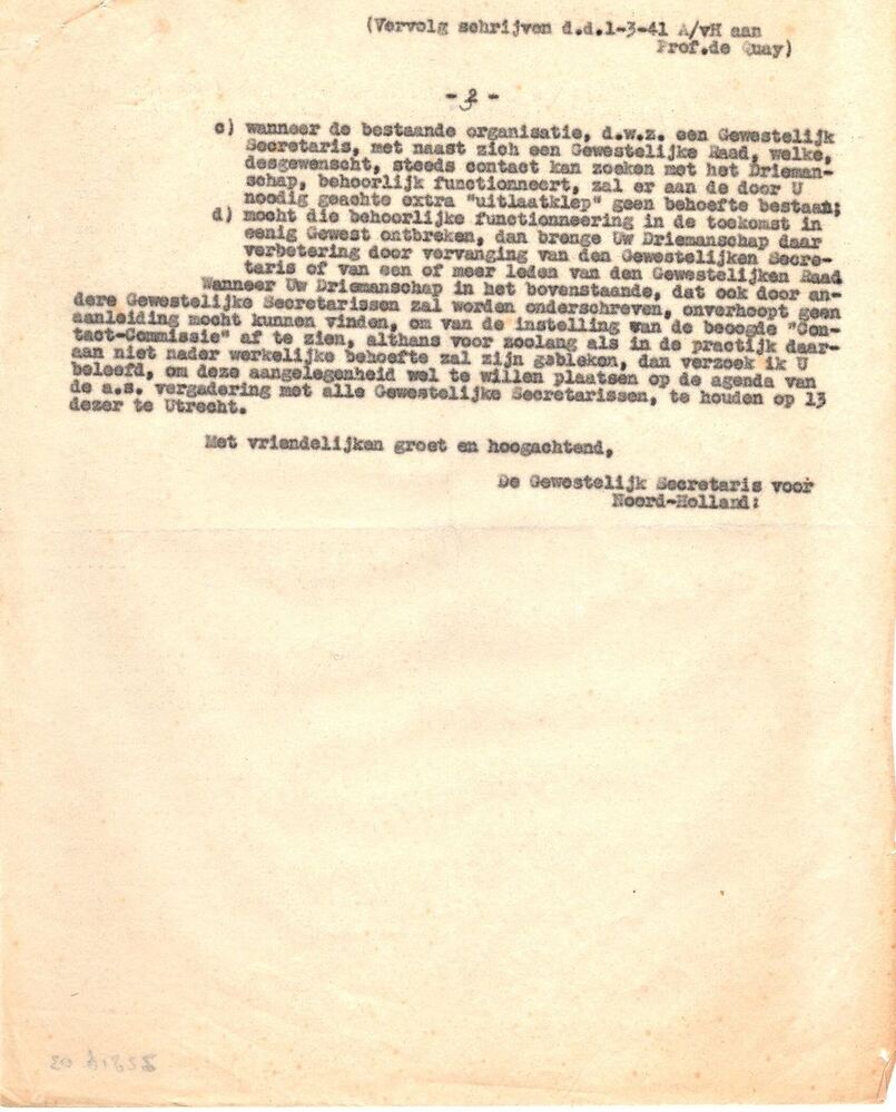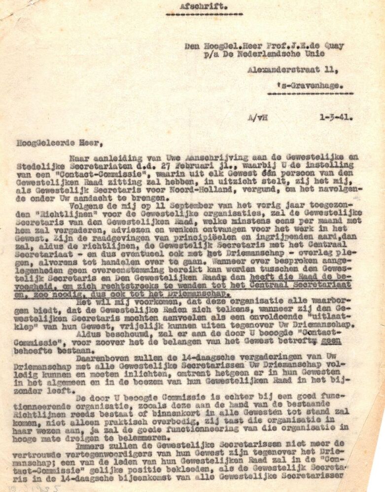Afschrift brief van de gewestelijk secretaris Noord-Holland aan Prof. J H de Quay.
