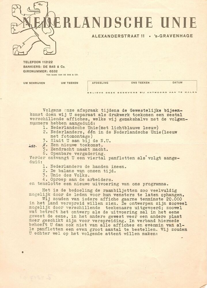 Brief van de Nederlandsche Unie betreffende toezending affiches.