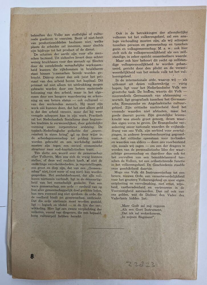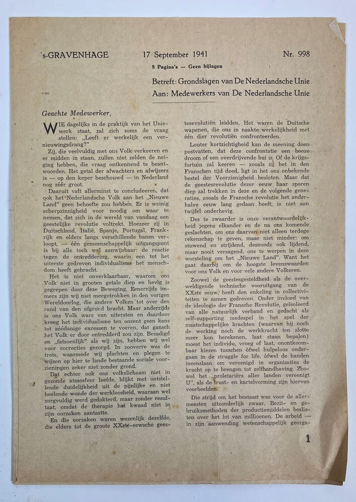 Pamflet Nr 998 aan de medewerkers van de Nederlandsche Unie (8 pagina's). Betreft Grondslagen van de Nederlandsche Unie.
