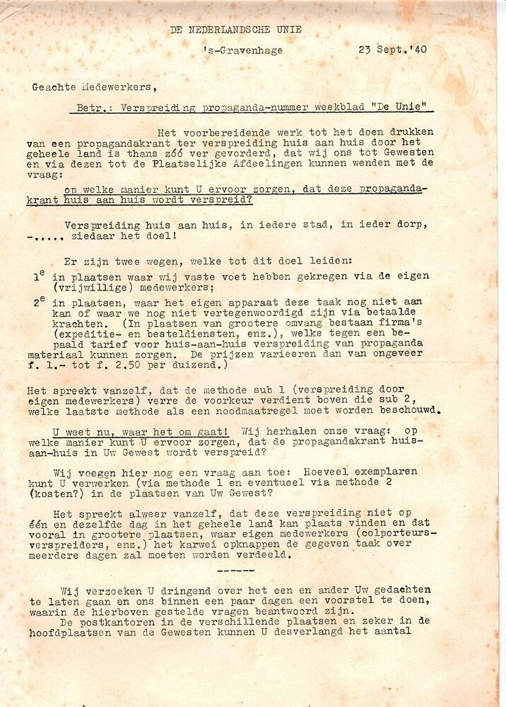 Pamflet aan de medewerkers van de Nederlandsche Unie betreffende de verspreiding propaganda-nummer weekblad "De Unie".