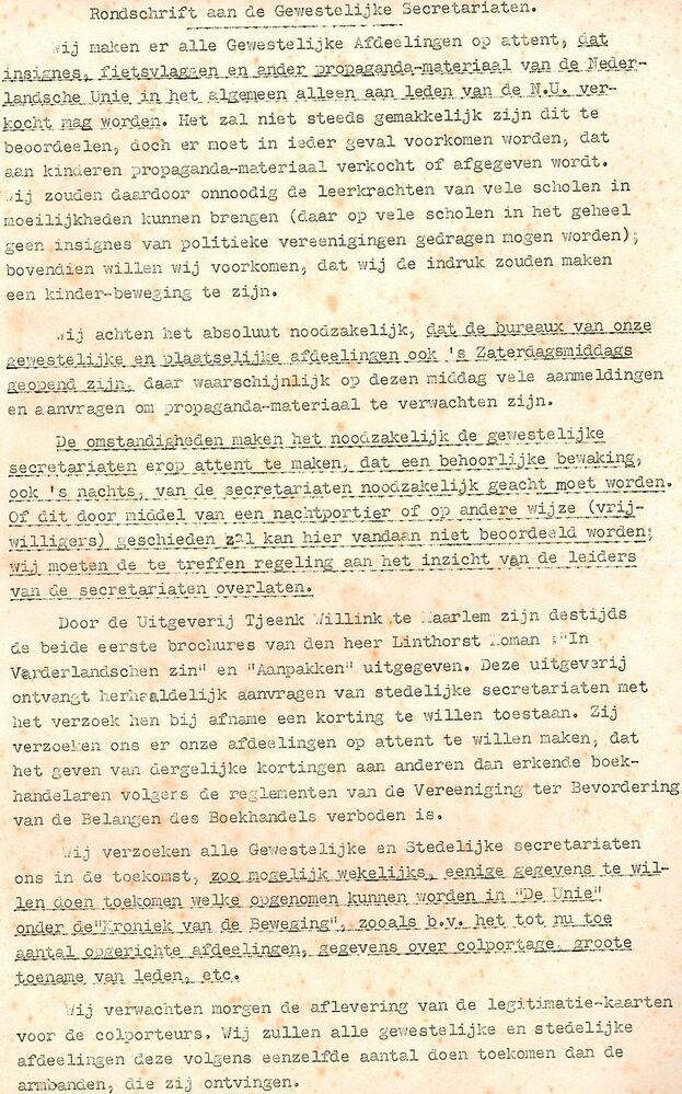 Rondschrift aan de Gewestelijke Secretariaten van de Nederlandsche Unie betreffende de verspreiding propaganda materiaal, de bewaking van de secretariaten en de aflevering van legitimatie-kaarten.