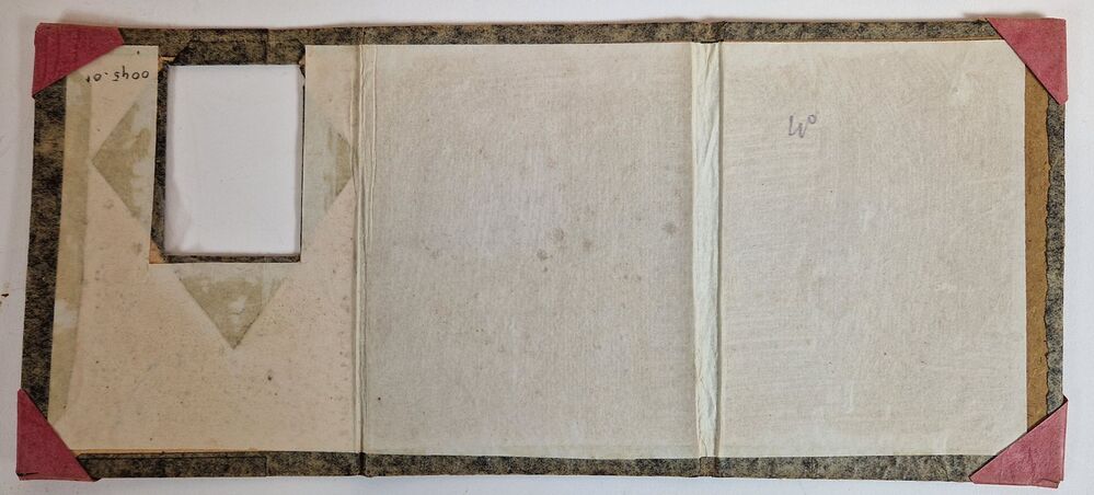 Kartonnen hoesje voor het beschermen van een persoonsbewijs. De plaats van de foto was uitgeknipt. Op de plaats van de pasfoto is waarschijnlijk een doorschijnend plastic geplakt geweest.