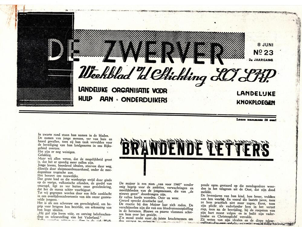 De Zwerver no 23. 2e jaargang. dd 8 juni. 14 pagina's losbladig Vanaf 14 mei 1945 werd de publicatie van Mededelingen voortgezet als Mededelingen van Centraal Bureau der LO en Afwikkelingsbureau LKP. Per 1 januari 1946 werd de titel De Zwerver gevoerd. Daarmee ging de 2e jaargang in. Het verscheen t/m de 5e jaargang (1949) ...