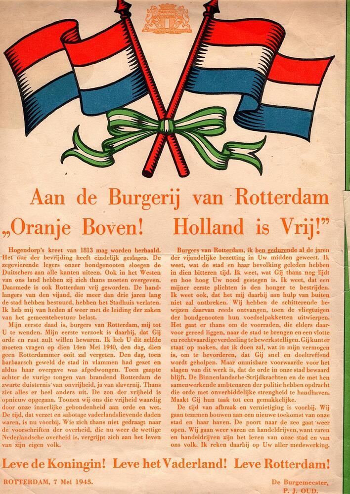 Pamflet "Aan de burgerij van Rotterdam " Oranje boven! Holland is vrij. Pamflet geschreven door Burgemeester P.J. Oud op 7 mei 1945.
