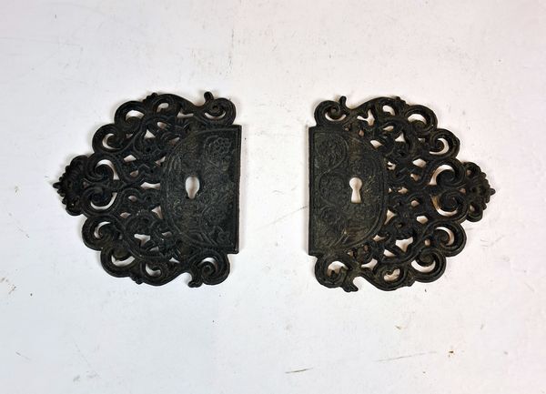 Twee stuks decoratief deurbeslag voor sleutelgaten. Het metalen beslag heeft een gestileerd bloemmotief.