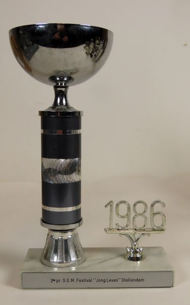 Zilverkleurige schaal op een grijze kolom waarop twee smalle en een brede zilverkleurige banden zijn aangebracht. De kolom staat op een kelkvormige voet. Het geheel is gemonteerd op een rechthoekige voet van grijs marmer. Naast de schaal is op de marmeren voet een zilverkleurig ornament aangebracht met daarop in opengewerkte cijfers het getal 1986. Op ...