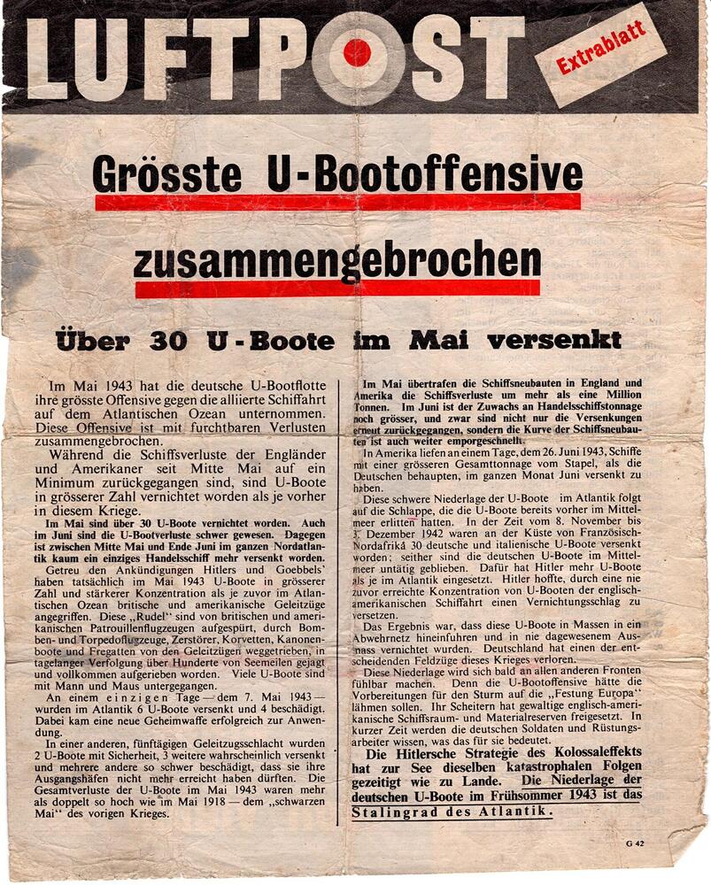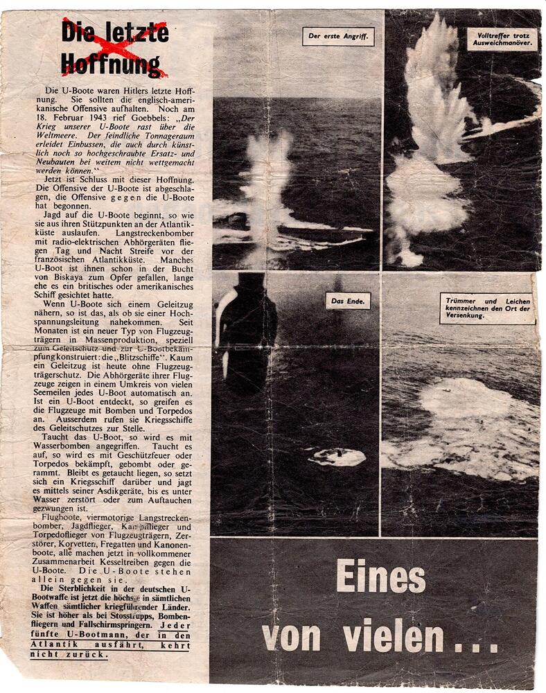 Een in 1944 boven Duitsland verspreid pamflet, met feiten over de duikbootoorlog.