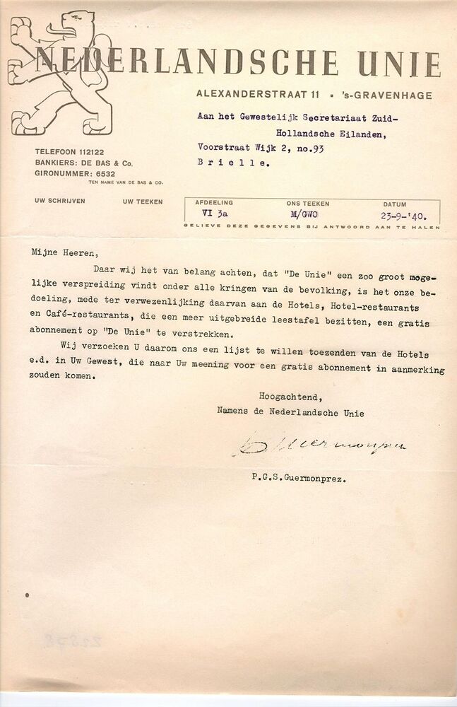 Brief aan het gewestelijk secretariaat Zuid-Hollandsche Eilanden met verzoek om adressen voor gratis abonnement op "De Unie".
