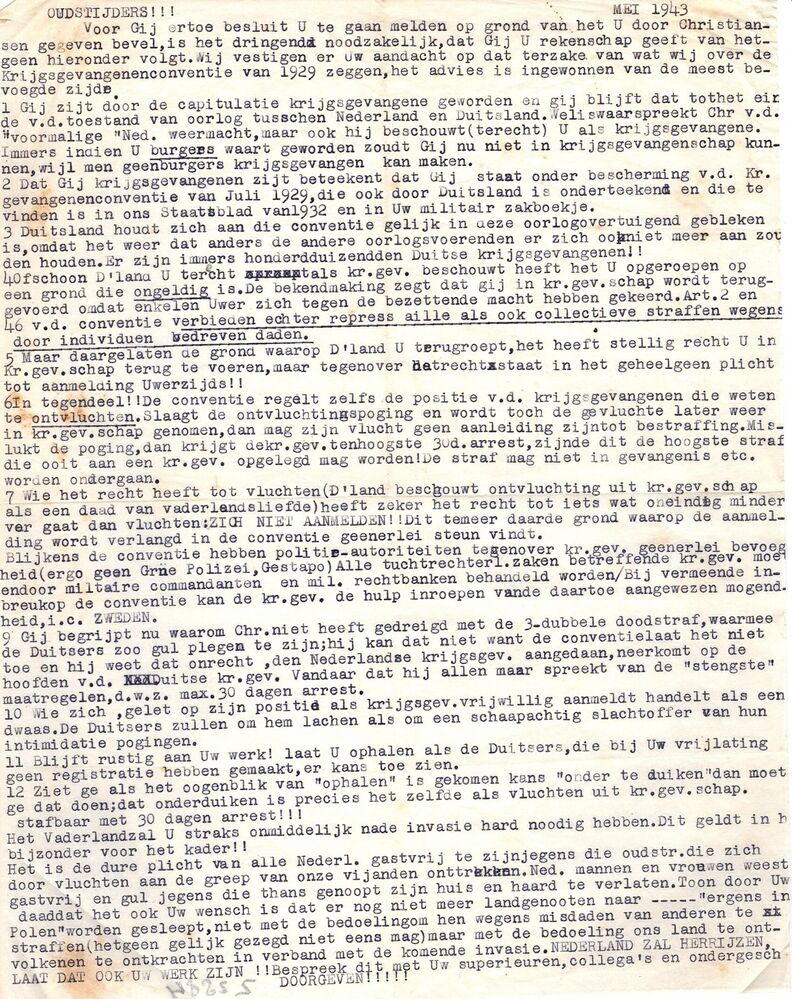 Getypt pamflet met oproep aan oudstrijders zich niet te melden bij de Duitse bezetter.