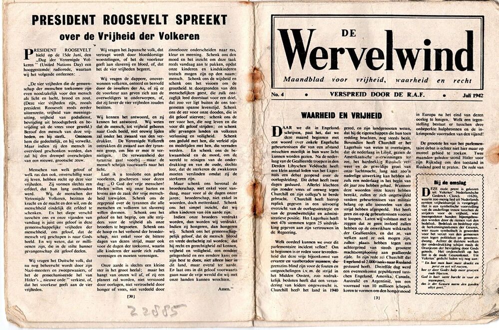 Pamflet "De Wervelwind", maandblad voor vrijheid, waarheid en recht, No 4, juli 1942, verspreid door de R.A.F. , 30 pagina's .
