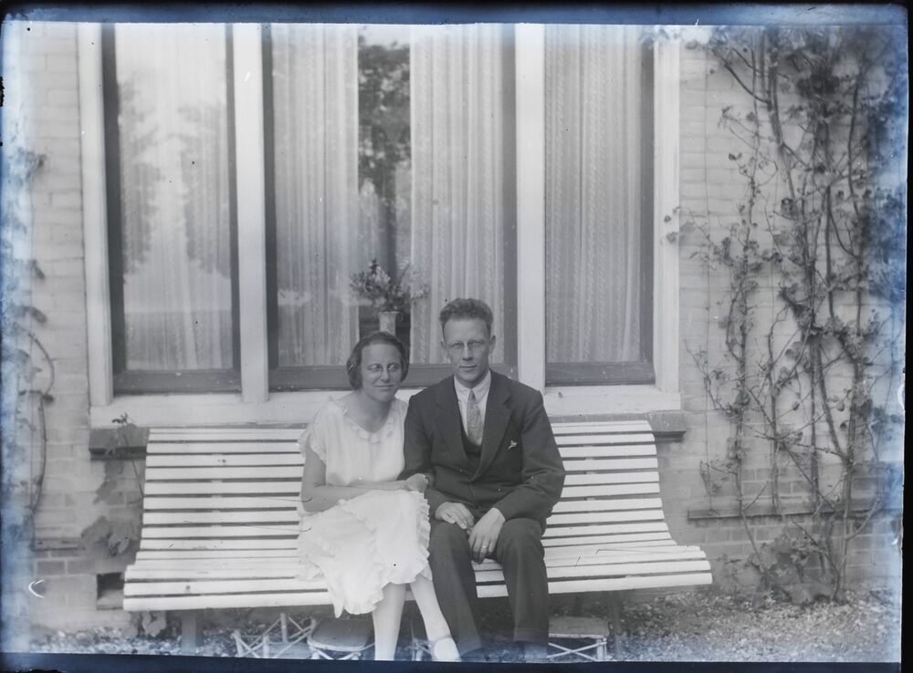 Echtpaar op bankje genomen achter hun woning “Villa Anna” halverwege de Wieldijk tussen Heenvliet-Nieuwesluis. Het betreft vermoedelijk familie van het echtpaar Boers-Cording,zoon Marie Cornelis Boers en zijn verloofde.