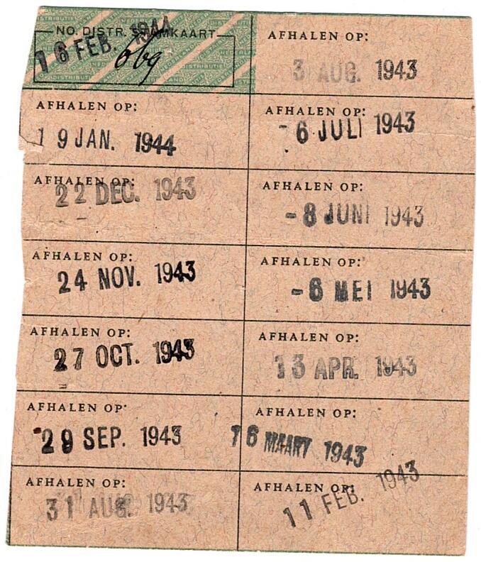 Gestempelde distributiekaart uit de Tweede wereldoorlog. Op deze kaart staan maandstempels van 11-2-1943 t/m 10-2-1944. De kaart is doormidden geknipt en alleen de rechter helft is aanwezig.