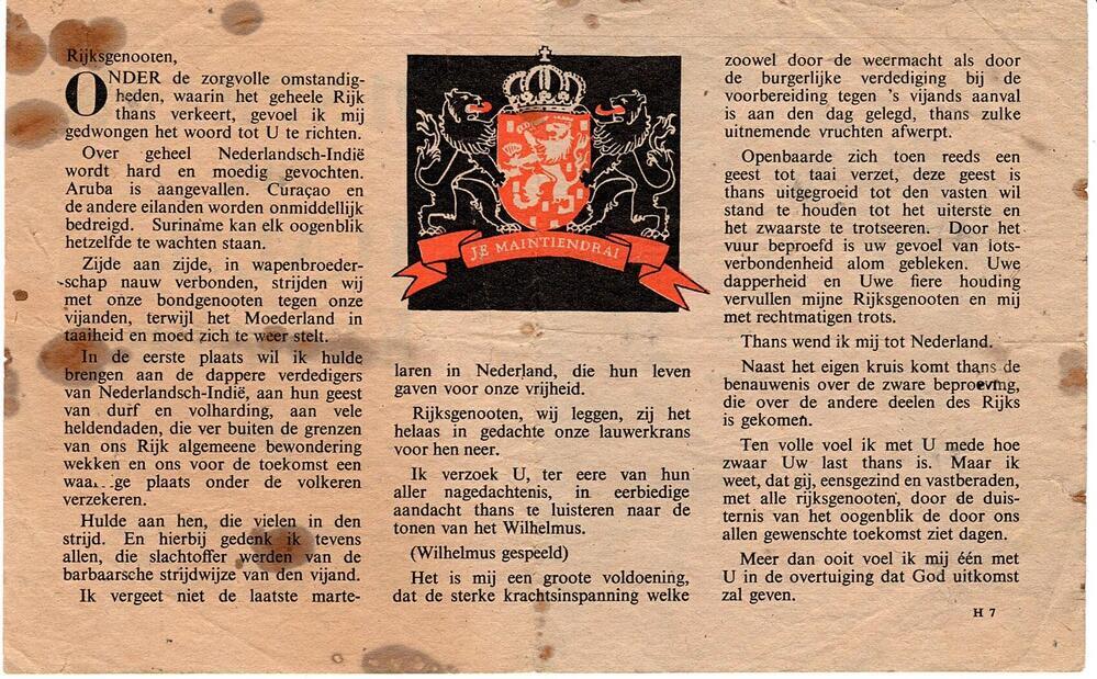 Tekst van de Radio toespraak door Koningin Wilhemina op 21 februari 1942. Deze toespraak werd uitgezonden door Radio Orranje. De rede werd verder via strooibiljetten boven Nederland uitgestrooid. ( zoals dit exemplaar )