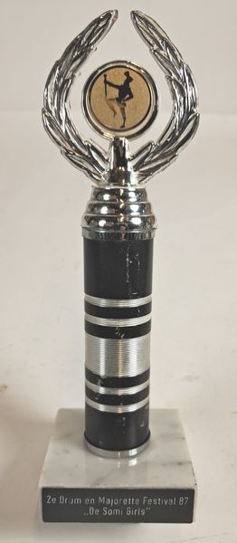 Kleine metalen zuil met bovenaan een rond plaatje met links en rechts een lauwertak. Op de zuil zijn vier smalle en één brede zilverkleurige ringen gegraveerd. Op het plaatje de afbeelding van een majorette op een goudkleurige ondergrond. Op de voorzijde van de voet een metalen plaatje met de inscriptie: 2e Drum en Majorette Festival ...