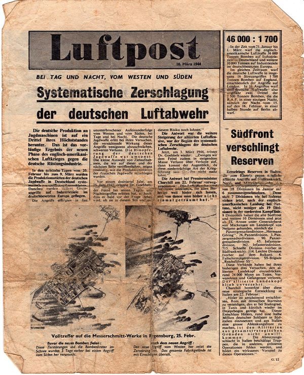 Luftpost van 10-3-1944 waarin verschillende onderwerpen in het Duits behandeld worden. Pamflet uitgeworpen door vliegtuigen. Beschrijft de successen van de geallieerden. Het pamflet bestaat uit 4 pagina's. ( in rechter onderhoek staat het nummer G. 12)