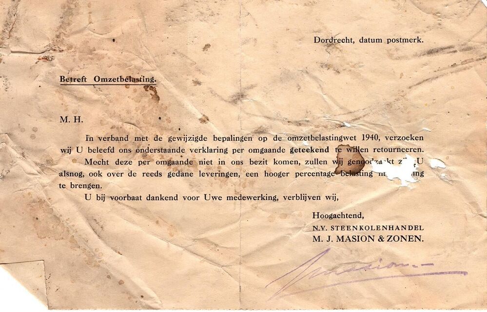 Voorgedrukte brief van N.V. Steenkolenhandel M.J. Masion&zonen betreffende omzetbelasting