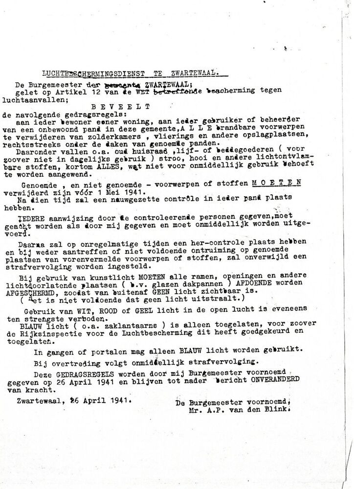 Kopie van een bevel van de burgemeester van Zwartewaal omtrent bescherming tegen luchtaanvallen