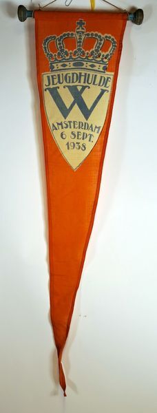 Wimpel van oranje linnen, bedrukt met wit en blauw, voorstellende een gekroond schild met daarop de tekst JEUGDHULDE AMSTERDAM 6 SEPT. 1938. Tussen JEUGDHULDE en AMSTERDAM staat een hoofdletter W. De wimpel hangt aan een houten dwarslat, blauw beschilderd, met ronde knoppen aan de uiteinden. Ter gelegenheid van het 40-jarig regeringsjubileum van koningin Wilhelmina in ...