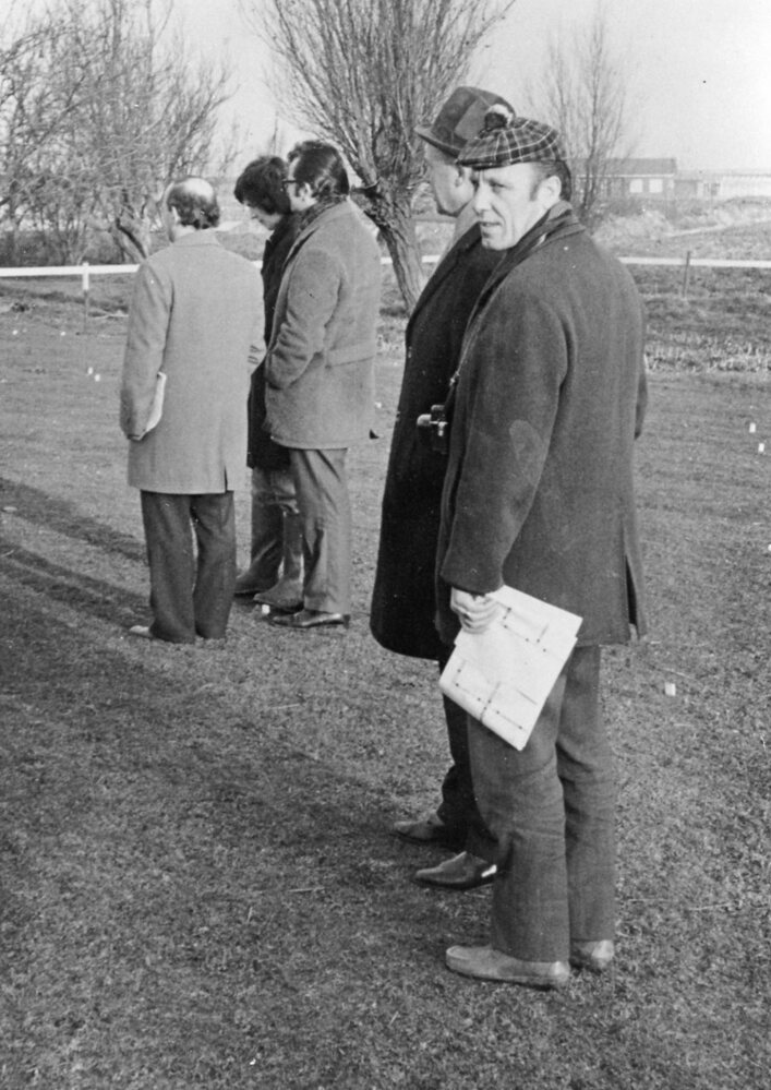 Foto.zwart/wit Slaan eerste paal dorpshuis, Burgermeester J.G. Bosch,Opzichter Piet Maas