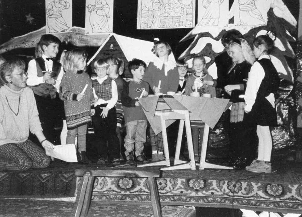 Foto, zwart/wit, v.l.n.r; kindergroep NH kerk kerstviering