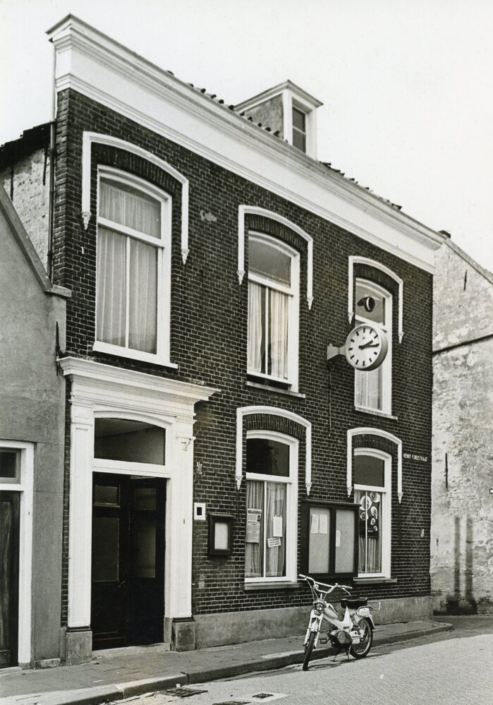 Foto, zwart/wit, Gemeentehuis Henry Fordstraat 2. Voor de deur een brommer; Tussen de ramen de kast met aankondigingen
