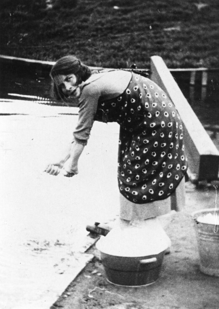 Foto, zwart/wit; Jo van Hulst Schelling aan de was. Door het hoge water kan de was uitgespoeld worden in de haven. Dit gebeurde bij teruggaand tij, dan trok het zout eerst weg.