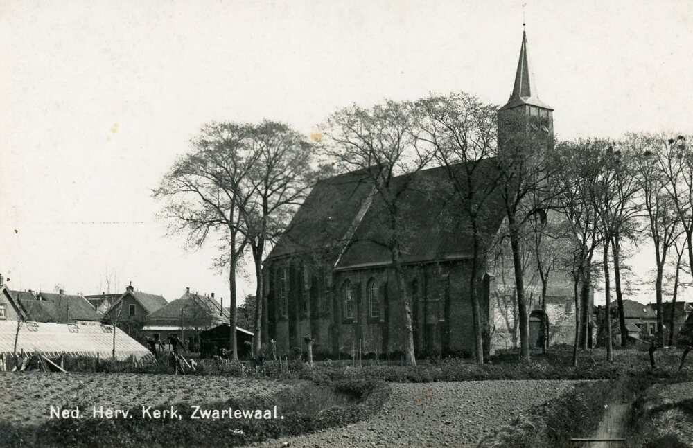 Foto, zwart/wit, Ned Herv Kerk, voor de beeldenstorm de St Martinuskerk.Foto van voor de aanleg van de huidige Looijerijweg. Links van de kerk de oude lagere school en de druivenkas van Piet Breedvaart.